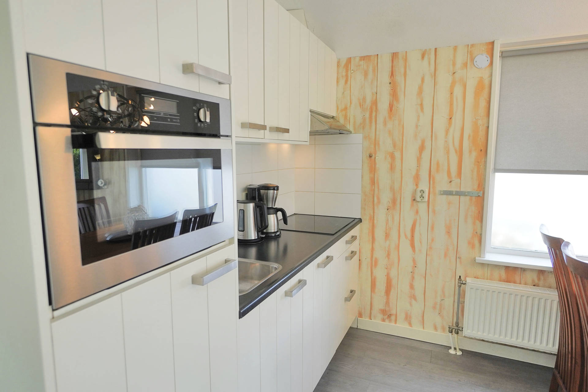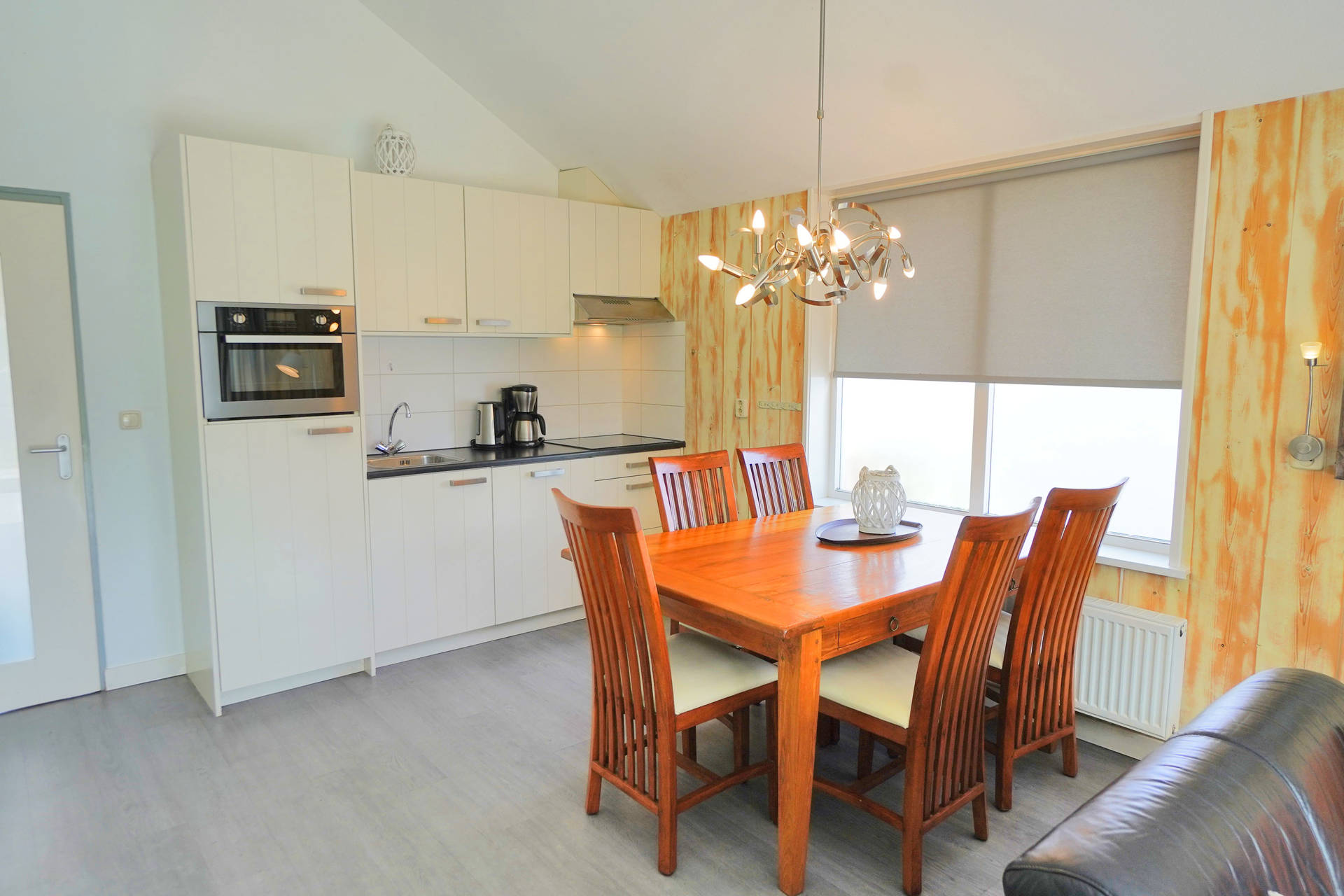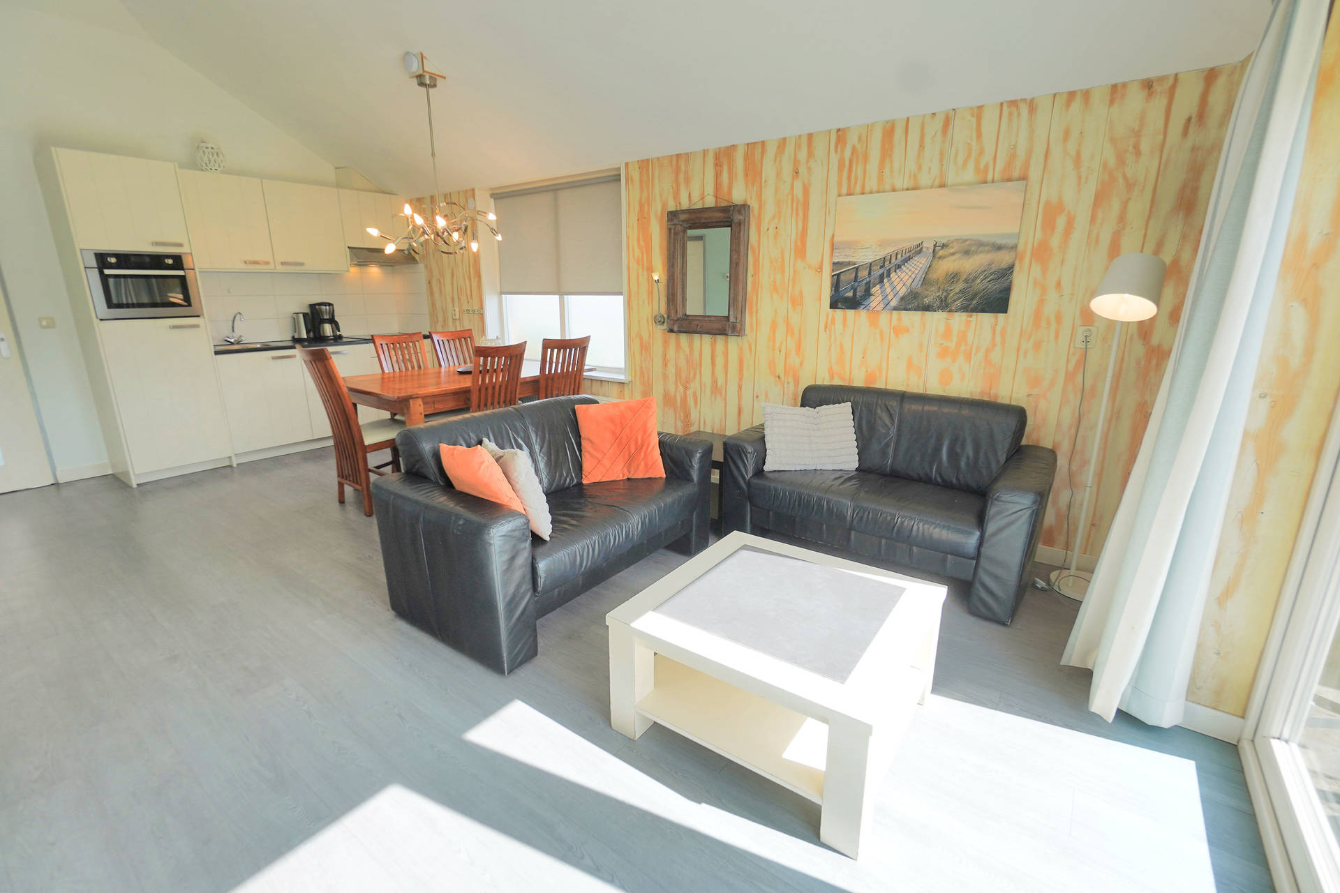 U komt het vakantiehuis binnen in een kleine entree met toegang tot de badkamer en de woonkamer met open keuken. De lichte woonkamer is modern en strak ingericht met 2 bankstellen en ruime eettafel. De open keuken is van alle gemakken voorzien met o.a. vaatwasser, koelkast met vriesvakje, een combi magnetron en een inductie kookplaat.