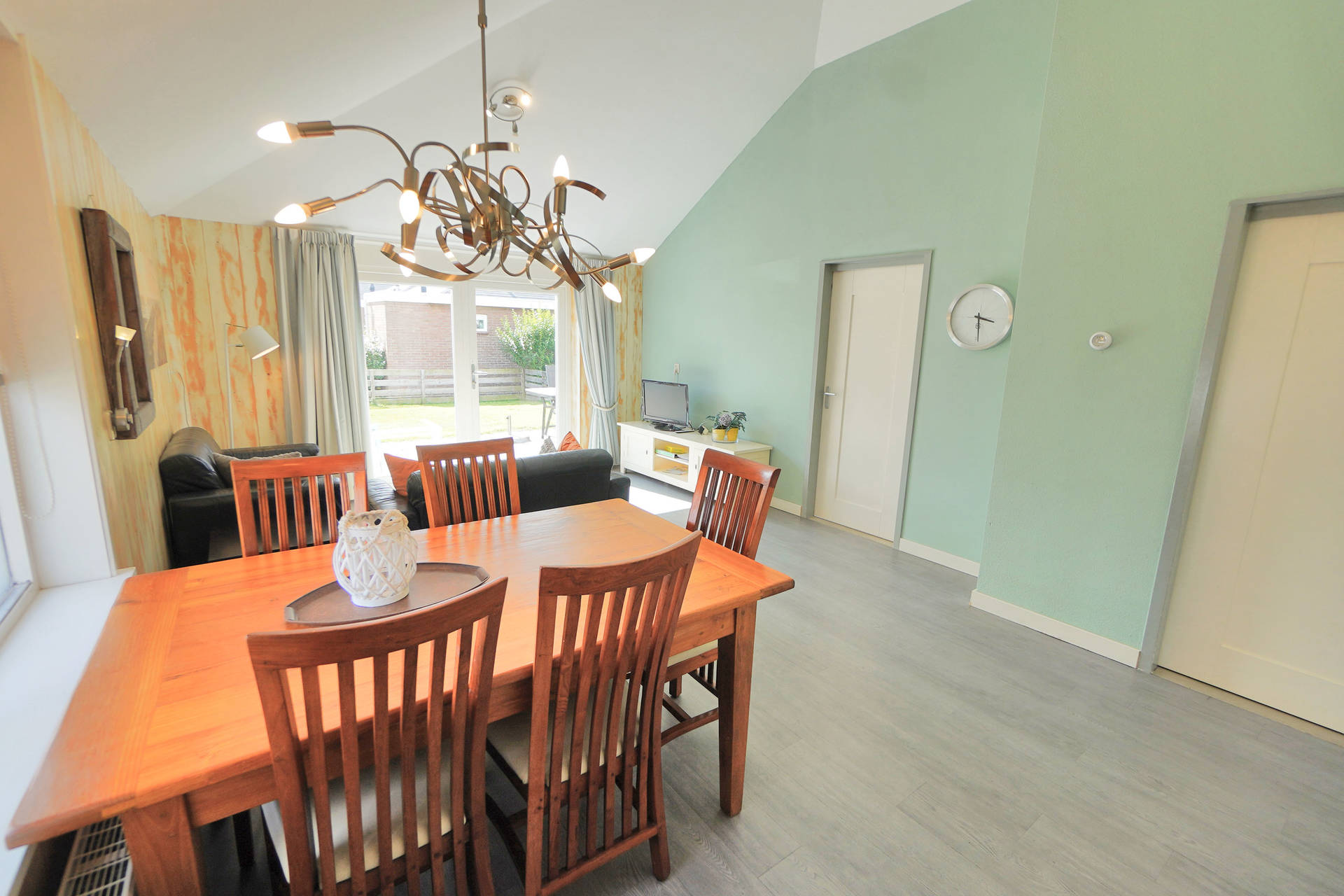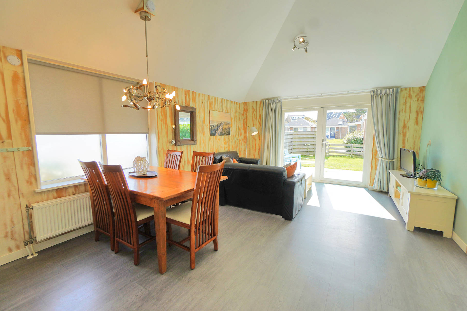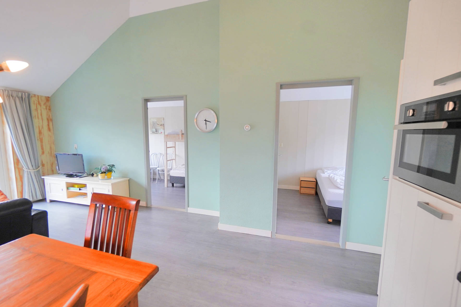 U komt het vakantiehuis binnen in een kleine entree met toegang tot de badkamer en de woonkamer met open keuken. De lichte woonkamer is modern en strak ingericht met 2 bankstellen en ruime eettafel. De open keuken is van alle gemakken voorzien met o.a. vaatwasser, koelkast met vriesvakje, een combi magnetron en een inductie kookplaat.
