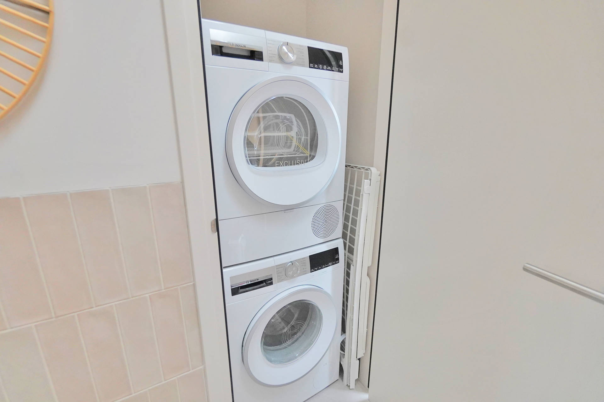 Upstairs, you’ll find three additional bedrooms with comfortable boxspring beds, along with a second bathroom featuring a walk-in shower, double washbasin, and toilet. On the ground floor, the hallway includes a guest toilet as well as a washing machine and dryer for added convenience.