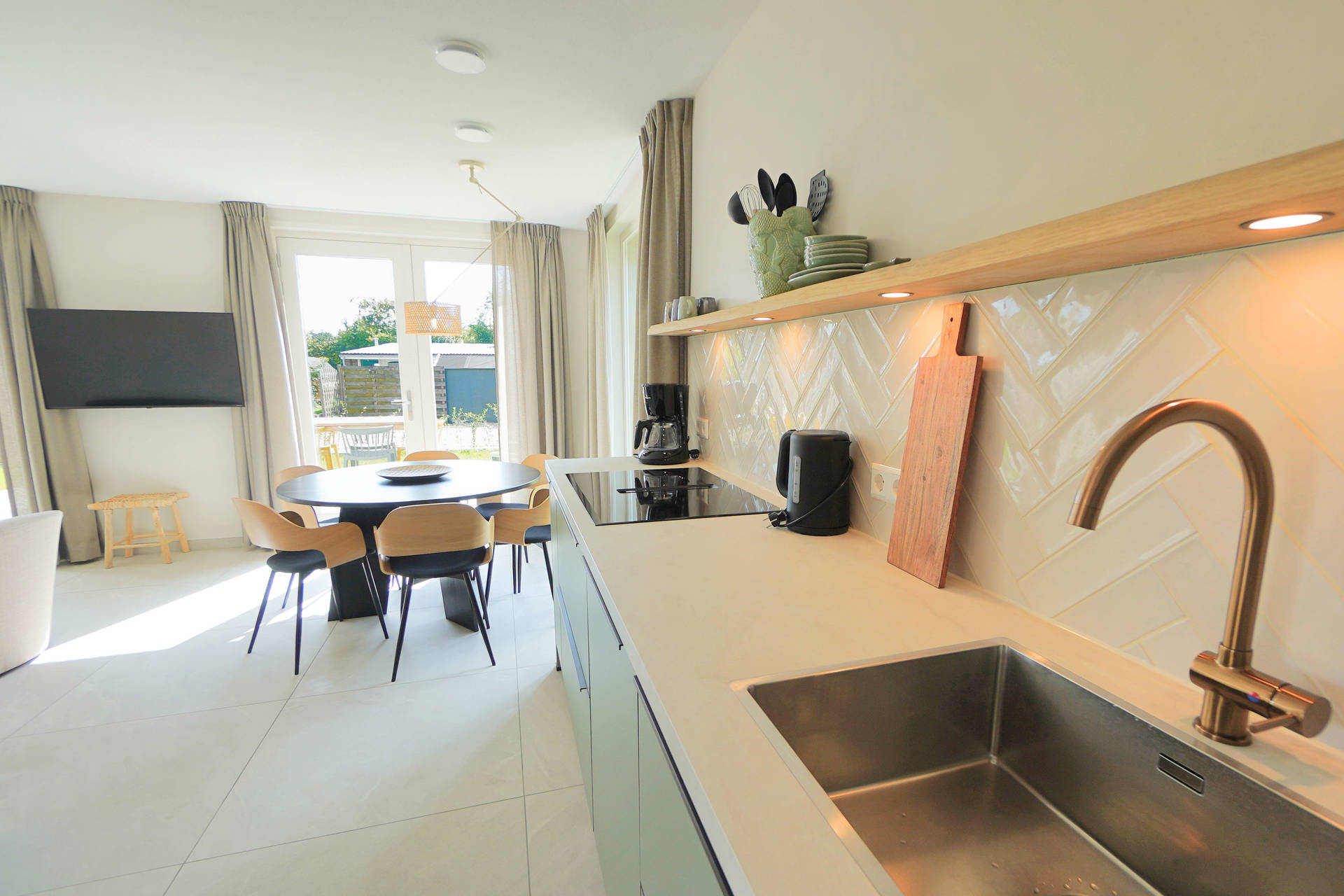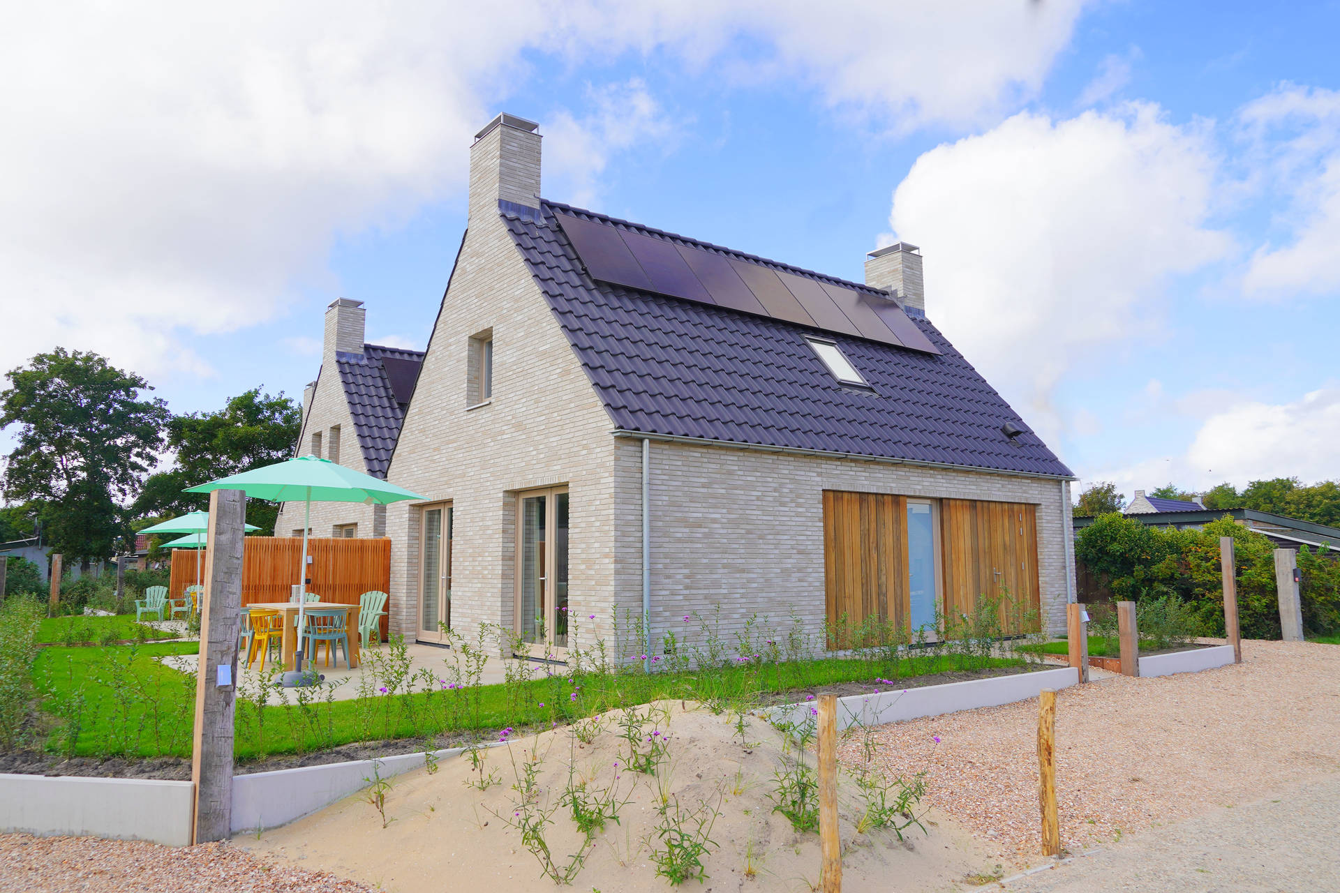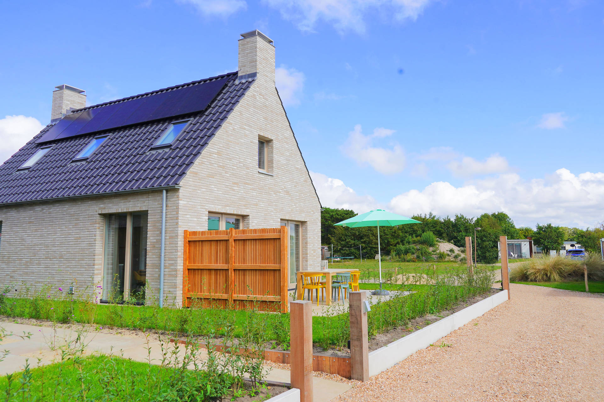 Inside, Holiday Home Zon offers a smart and practical layout with three comfortable bedrooms, including one on the ground floor with its own en-suite bathroom – ideal for those who prefer everything on one level. The open-plan kitchen is equipped with modern appliances such as an induction hob, fridge with freezer compartment, and dishwasher – perfect for preparing a generous breakfast or a relaxing dinner after a day by the sea.